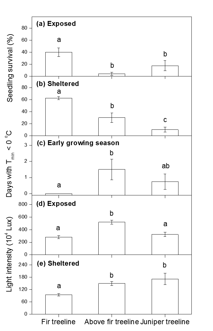 图4. 不同移植地点之间冷杉幼苗存活率(a开阔地,b遮荫)、生长季早期冻害事件频率(c)和光照强度(d开阔地,e遮荫)的差异。不同字母表示不同地点间存在显著差异(P < 0.05)。
