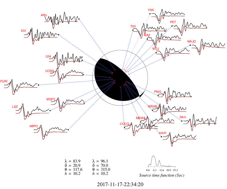 Lower-hemisphere projection is used here. The observed P wave records (black line) and the synthetic seismogram (red line) based on the simple point model are compared. The parameters of two possible fault planes are listed also, with l, d, q ,h indicating the rake angle, dip angle, strike direction and source depth respectively. The obtained source time function are plotted.
