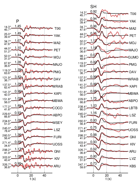 Comparison of observed (black) and synthetic waveforms (red) for P vertical components, and SH components are shown in the panel, the azimuth, epicentral distance, amplitude ratio and station name are also indicated