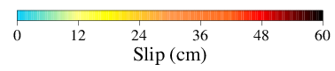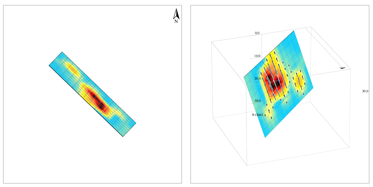 范围之内)和22个SH波波形资料进行点源模型的震源机制解反演;根据反演结果构建有限断层模型进行震源过程反演,获得了这次地震破裂滑动分布的初步结果。计算得到的地震矩为5.0×1018Nm,Mw=6.4。最大滑动约60cm。