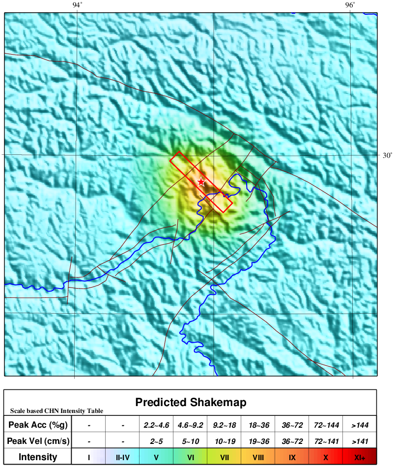 初步结果表明:这次地震为震级Mw6.4,震源深度约10km的高倾角逆冲型地震,破裂持续时间约13秒,破裂没有明显的方向性,断层面上的滑动分布比较集中。计算震中区的理论最大地震烈度(中国地震烈度表,2008)约为VIII-IX度。