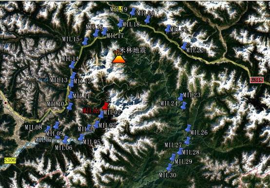 此次地震的余震主要呈北西向分布,发震断层可能倾向北东。因此,科研人员将在此次余震监测的预计位置-震中周边的巴宜区、米林县、波密县和墨脱县境内,迅速布设30个流动地震台站(图2),台站间距约5-10 km。
