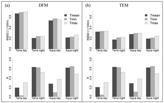 图1. DFM方法(a)和TEM(b)方法对日平均、日最低和日最高气温的温度递减率估算精度的对比。