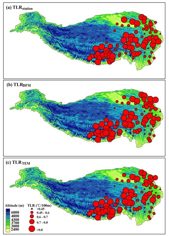 图2. DFM方法(b)和TEM(c)方法估算的气温递减率与观测的气温递减率(a)的空间分布。