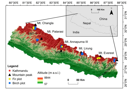 最近,中科院高寒生态学与生物多样性重点实验室、青藏高原地球科学卓越创新中心梁尔源研究员课题组基于新建立的喜马拉雅山中段(尼泊尔境内)的树线样地网络,揭示了气候变暖导致了树线的上升,但上升速率受到春季降水的调控。