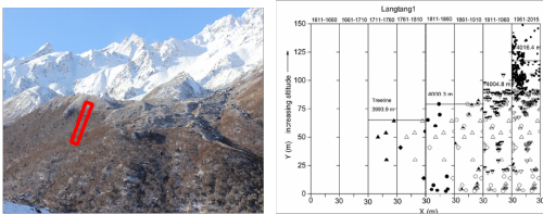 图2. 郎唐山谷一块糙皮桦30m×150m的树线景观和样地示意图(左);基于样地调查,重建每50年的时间尺度上的树线位置(海拔)变化,时段内更新的植株用实心符号表示,以后时段用空心符号表示。