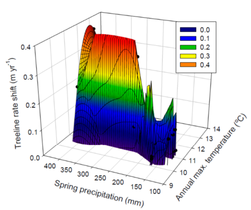 树线是指高度2米以上的树木分布的海拔上限或纬度北界。基于全球不同地区树线样点土壤温度的相似性,学者们普遍认为生长季温度或生长季长度控制着树线形成。最近的研究则揭示,喜马拉雅山南坡高山林线、树线上树木的生长受降水限制,因此降水也是驱动树线形成的关键气候因子(Liang et al. 2014, Ecology)。然而,我们依然不清楚降水变化是否影响树线上升速率?如何量化和区分温度和降水对树线动态的影响?