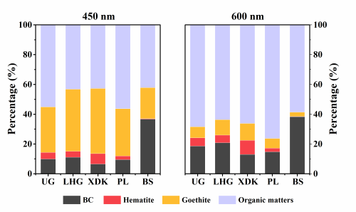 在广泛应用的雪冰辐射模拟软件(如SNICAR)中,输入参数主要是沙尘的质量浓度,而对沙尘的组成特征缺乏考虑。实际上,沙尘的吸光能力依赖于其中的铁氧化物,如针铁矿、赤铁矿等。因此研究青藏高原冰川表面冰尘中铁氧化物的矿物形态、光学特征能够为完善、改进雪冰辐射效应模拟提供关键输入参数。然而常规方法如XRD、化学方法和Mossbauer谱难以准确测定复杂冰尘样品中赤铁矿和针铁矿的含量。本研究针对野外采集的5处青藏高原冰川(图2)冰尘样品,利用漫反射光谱DRS准确测量了冰尘中针铁矿和赤铁矿的含量,发现铁氧化物占总铁的31%-70%,其中针铁矿含量显著高于赤铁矿,占铁氧化物的81%-98%。同时对冰尘样品的黑碳含量进行了热光法测定。在此基础上,利用积分光谱仪(ISSW),获得了冰尘整体样品、针铁矿和赤铁矿的吸光特征 (MAC和AAE值),并进一步计算了冰尘样品中针铁矿、赤铁矿、黑碳和有机质等吸光组分对冰尘总吸光的相对贡献。结果显示,在600nm波段有机质和黑碳是最为主要的吸光组分,而在450nm波段铁氧化物的贡献迅速增加,在多数冰川冰尘中针铁矿的吸光已高于黑碳(图3)。该研究为准确评估吸光性杂质对冰川消融的影响奠定了基础。