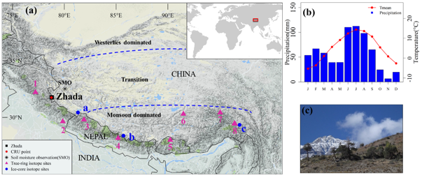 图1. (a) 札达取样点在西喜马拉雅山北坡的位置(黑色方形),喜马拉雅山及周边树轮氧同位素(1-8,粉色三角形)、冰芯氧同位素(a-c,蓝色圆形,纳木纳尼、达索普和左求普冰芯)的主要研究。青藏高原西风主导区、季风主导区以及过渡区的划分依据Yao et al. (2013);(b) 札达取样点每月的降雨、温度变化(CRU,TRMM资料);(c) 取样点的残留木。
