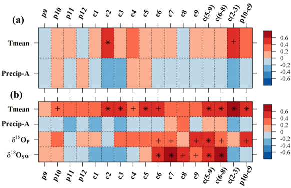 图2. 札达树轮氧同位素与CRU(a,1979-2015)、LMDZ4(b,1980-2010)取样格点数据的相关分析结果。Tmean, Precip-A, δ18OP, δ18OSW 分别表示温度、降雨量、降雨同位素、土壤水同位素。星号(*)和加号(+)分别表示对应的相关系数达到99%、95%的显著性水平。