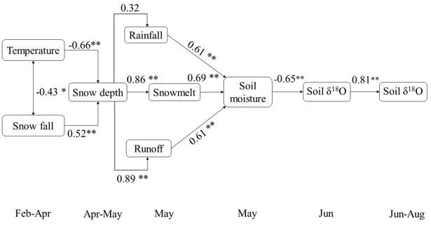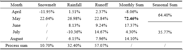 表 1. 不同月份积雪融化、降雨、径流对夏季土壤水同位素的贡献比例。