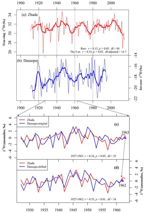 图4. 札达树轮氧同位素(红线)与达索普冰芯氧同位素(蓝线)的对比。(a)和(b)中的细线、粗线分别表示年值和5年滑动值。(c)和(d)为树轮氧同位素和达索普冰芯氧同位素的对比,(d)展示了冰芯标志年调整为1962之后,二者匹配更为一致。