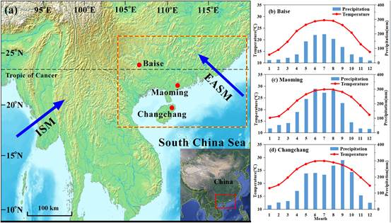 图1 研究区地理位置(a);百色(b)、茂名(c)和长昌(d)各月平均降水量、气温