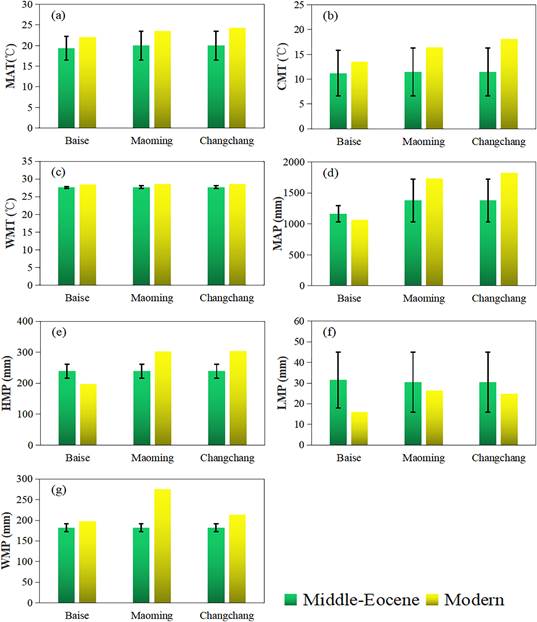 图2 百色、茂名和长昌中始新世气候参数与现今气候参数的对比。MAT:年均温;CMT:最冷月均温;WMT:最热月均温;MAP:年均降水量;HMP:平均最大月降水量;LMP:平均最小月降水量;WMP:平均最暖月降水量。