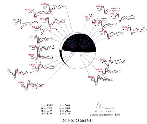 采用下半球投影,同时给出了点源模型的P波垂向位移理论图(红线)与资料(黑线)的拟合情况。图形下方给出了两组节面解(左下,λ,δ,θ,h分别表示错动倾伏角、断层倾角、断层走向、震源深度)和点源模型的震源时间函数(右下)。