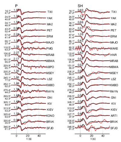 Figure 2 Comparison of the observed teleseismic P and SH records with the synthetic waveforms.