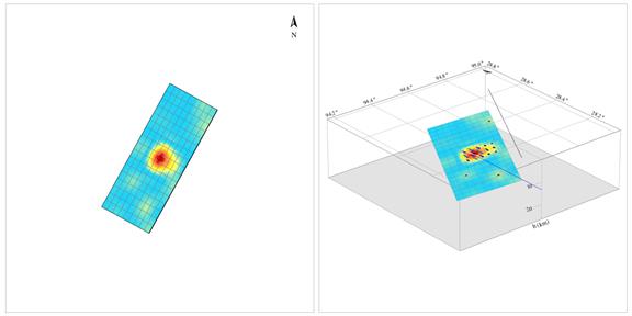 Surface projection of fault model ( up-left ) and 3D view of the fault model ( up-right ) are shown