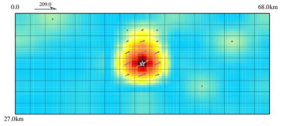 范围之内)和20个SH波波形资料进行点源模型的震源机制解反演;根据反演结果构建有限断层模型进行震源过程反演,获得了这次地震破裂滑动分布的初步结果。计算得到的地震矩为1.97×1018Nm,Mw=6.1。最大滑动48cm。