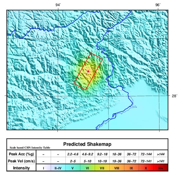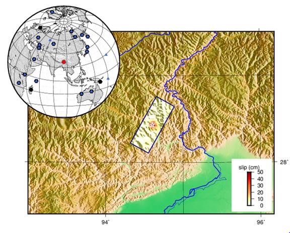 初步结果表明:这次地震为震级Mw6.1,震源深度约12km的小倾角左旋走滑兼具逆冲型地震,破裂持续时间约10秒,破裂扩展没有明显的方向性,断层面上的滑动分布比较集中。计算震中区的理论地震烈度(中国地震烈度表,2008)约为VII-VIII度。