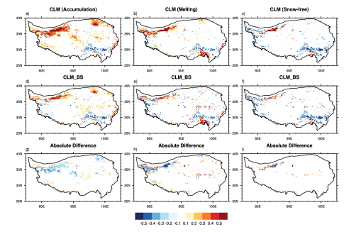 图2 不同积雪期(积雪积累期、积雪消融期和无雪期)原始的CLM和考虑了风吹雪过程影响的CLM_BS模拟的青藏高原积雪覆盖率偏差及其差异(CLM_BS-CLM)的空间分布特征