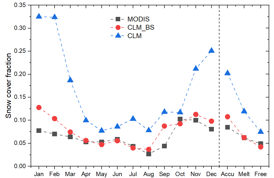 基于陆面过程模式Community Land Model version 4.5 (CLM4.5),通过耦合风吹雪模型PIEKTUK,发展了考虑风吹雪过程影响的风吹雪-陆面耦合模式(耦合模式风吹雪模块示意图如图1所示),并利用包括MODIS积雪覆盖和积雪面积产品、IMS逐日积雪产品、GLASS地表反照率产品、MODIS地表温度产品以及中国区域逐日积雪深度产品在内的一系列遥感产品,评估了耦合模式对于青藏高原积雪深度、积雪覆盖、地表反照率以及地表温度的模拟效果。评估结果表明,陆面过程模式中风吹雪过程的加入能够显著地改善模式对于青藏高原大部分地区积雪和地表能量关键要素的模拟效果,特别是昆仑山、可可西里以及青藏高原西南部等地的改善最为明显(图2)。陆面模式整体对于青藏高原积雪深度以及夜间地表温度存在普遍高估,而对于白天的地表温度则普遍低估,耦合模式对于夜间地表温度的模拟有明显的改善。在积雪模拟偏差减小的区域,考虑了风吹雪过程影响的耦合模式结果能够很好的反映出MODIS积雪覆盖率的月变化特征(图3)。风吹雪模型与CLM4.5的耦合,能够在一地程度上完善陆面过程模式中的高寒山区积雪水文过程参数化描述,对于提高模式高寒山区积雪过程以及地-气相互作用过程的模拟具有一定的促进作用。