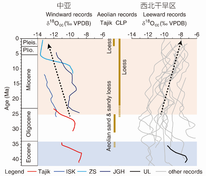 亚洲中部干旱区是全球最大的内陆型干旱区,是北半球最重要的粉尘源区,也是“丝绸之路”核心区。该地区新生代(距今6500万年以来的地质时期)干旱环境演化历史及其驱动机制研究,为理解我国干旱-季风耦合环境何时、何因形成提供关键证据。
