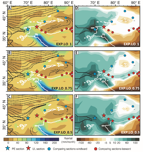 中科院青藏高原研究所陈发虎院士团队与兰州大学西部环境教育部重点实验室亚洲内陆粉尘和干旱化研究团队王鑫副教授等瞄准国际前沿科学问题,围绕中亚塔吉克盆地早新生界地层开展了深入研究工作。他们联合美国、德国、塔吉克斯坦等多家研究机构,基于可信的古地磁年代标尺(王鑫等, 2019, GRL),综合碳酸盐稳定氧同位素、沉积相、元素地球化学、粘土矿物等证据,发现自约2500万年开始,帕米尔-天山西侧迎风坡一侧区域气候变湿、碳酸盐氧同位素整体偏负,而东侧背风坡一侧区域(如塔里木盆地)干旱化显著加剧,碳酸盐氧同位素整体偏重(图2),据此提出了亚洲内陆气候环境自约2500万年开始产生显著的东西向分异。并结合数值模拟和构造证据(图3),论证了帕米尔-天山部分山体可能在约2500万年已隆升到能产生环流效应的临界高度(约海拔3000米),揭示了帕米尔-天山的构造抬升及其对西风环流的机械分流是亚洲内陆气候环境格局形成的主因,为认识新生代亚洲内陆干旱环境的时空演变历史及可能驱动机制提供了新视角,也为认识西风-季风协同作用过程及其气候环境效应提供了西风区的长序列地质记录。