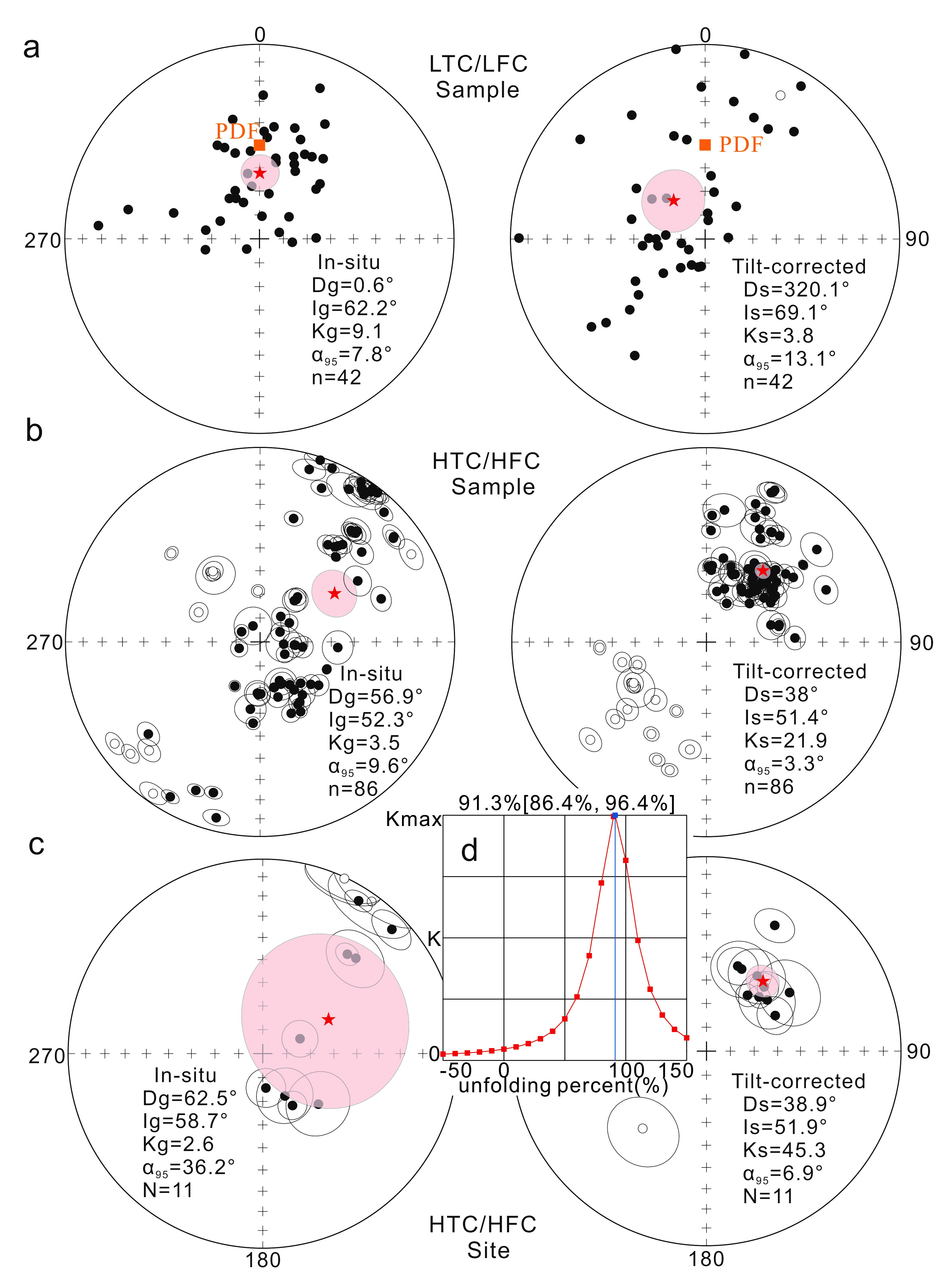 图3 巴塘群火山岩低温(低场)组分方向(a)、高温(高场)组分方向(b, c)等面积投影图及逐步展开褶皱检验(d)