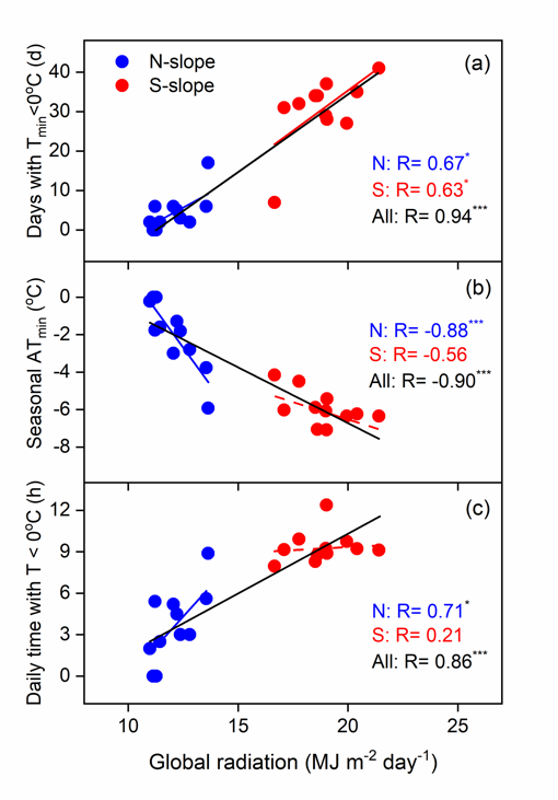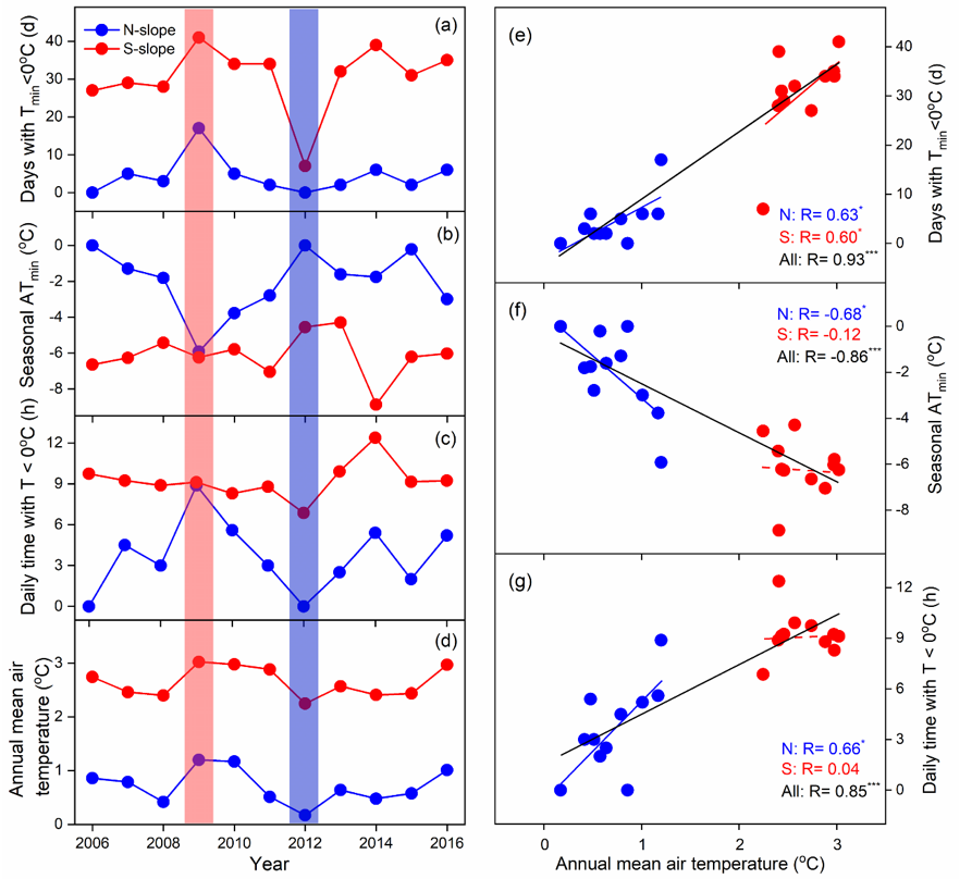 中科院青藏高原研究所生态系统格局与过程团队罗天祥研究员等基于藏东南色季拉山两典型树种(急尖长苞冷杉和方枝柏)林线的11年微气象观测数据(2006-2016),系统分析了生长季早期冻害事件特征与年平均气温、生长季开始时间及太阳辐射的关系。本研究将日最低土壤温度(-5 cm)2 °C作为定义生长季开始和结束的阈值,将生长季早期定义为从生长季开始至6月底。研究结果表明:1. 生长季早期冻害事件在阳坡及较温暖的年份更加频繁强烈,且有随年平均气温升高而增加的趋势(图1);2. 随生长季提前及太阳辐射增强,生长季早期冻害事件增加(图2和图3)。在季风气候影响下,太阳辐射的最大值通常出现在晴朗干燥的生长季早期(4-5月,季风来临之前)。