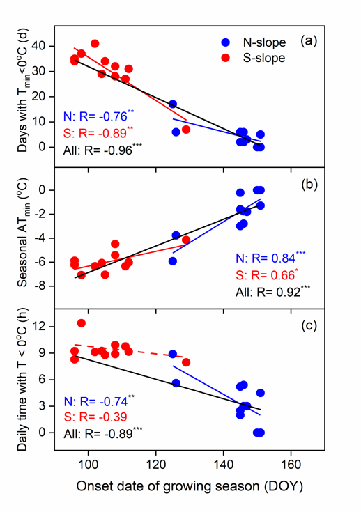 生长季提前和辐射冷却效应增强(日间太阳辐射越强、温度越高,夜间出现低温冻害事件的可能性越高)是导致高海拔地区生长季早期冻害事件增加的主要原因。本研究揭示了气候变暖下高海拔地区生长季早期冻害事件增加的物理机制,阐明了辐射冷却效应在高海拔地区春季冻害事件中的普遍作用,指出未来气候变暖下生长季早期冻害事件可能会增加。由于生长季早期冻害事件增加可能严重阻碍林线以上的幼苗生长,气候变暖背景下,高山林线的上升可能会出现减缓甚至停止。