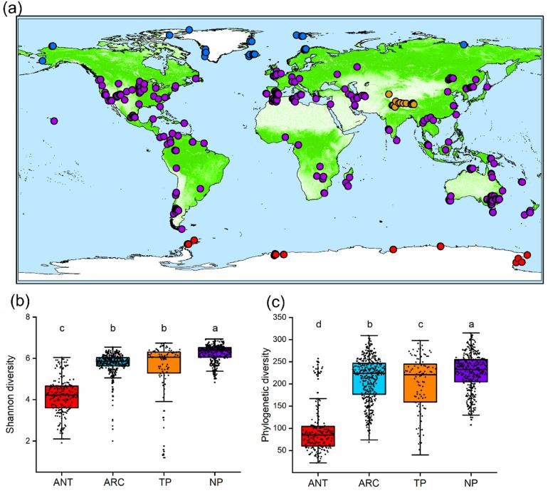 为此,中科院青藏高原研究所孔维栋研究员等联合研究国际南北极的知名科研团队,采用数据共享与样品采集等多方法,收集了南极、北极、青藏高原以及全球其他地区的1114个土壤微生物数据(图1),系统对比研究了极地和非极地区土壤微生物的多样性、群落结构及其驱动因子。