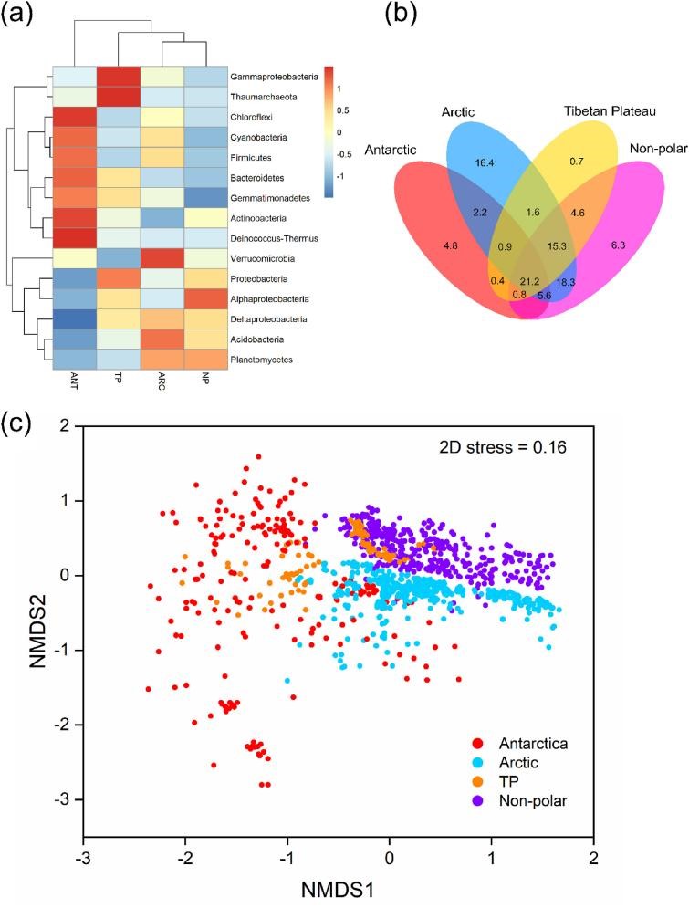 极地和非极地区土壤优势微生物种系的相对丰度(a),Venn图表示南极、北极、青藏高原和非极地区土壤共有和独有的微生物种的比例(按97%一致性序列归类),所示数字表示百分比(b)。基于Bray-Curtis相异度对极地和非极地区土壤样品进行非度量多维尺度分析(NMDS) (c)。