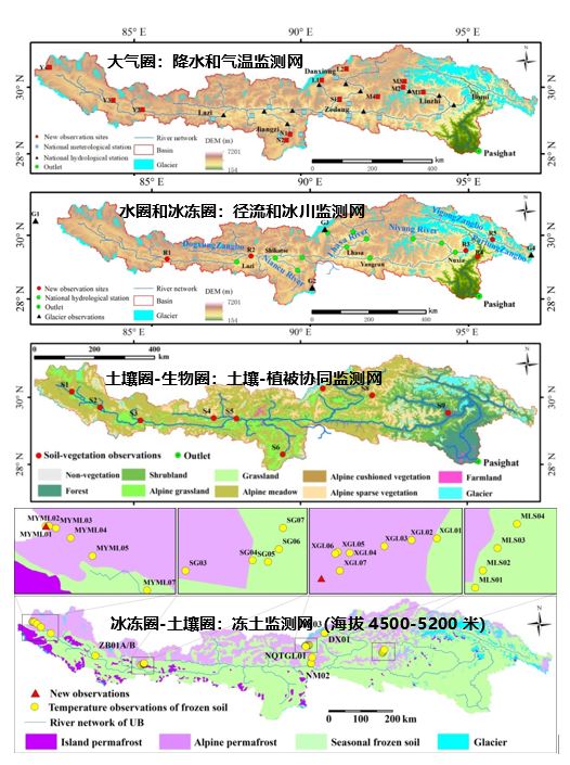为填补这一空白,自2017年以来,中国科学院青藏高原研究所环境变化与多圈层过程团队与合作者通过加强覆盖全流域的地面水文、气象、冰川、冻土、植被和土壤等的系统监测,结合该流域及其周边现有监测站,在该流域建立了一个大尺度的多圈层水文监测网络(包括大气圈、水圈、冰冻圈、土壤圈和生物圈的同期监测),以改善流域资料匮乏的现状;为定量解析雅鲁藏布江流域冰川-冻土-植被变化的协同关系及其径流效应提供观测基础。