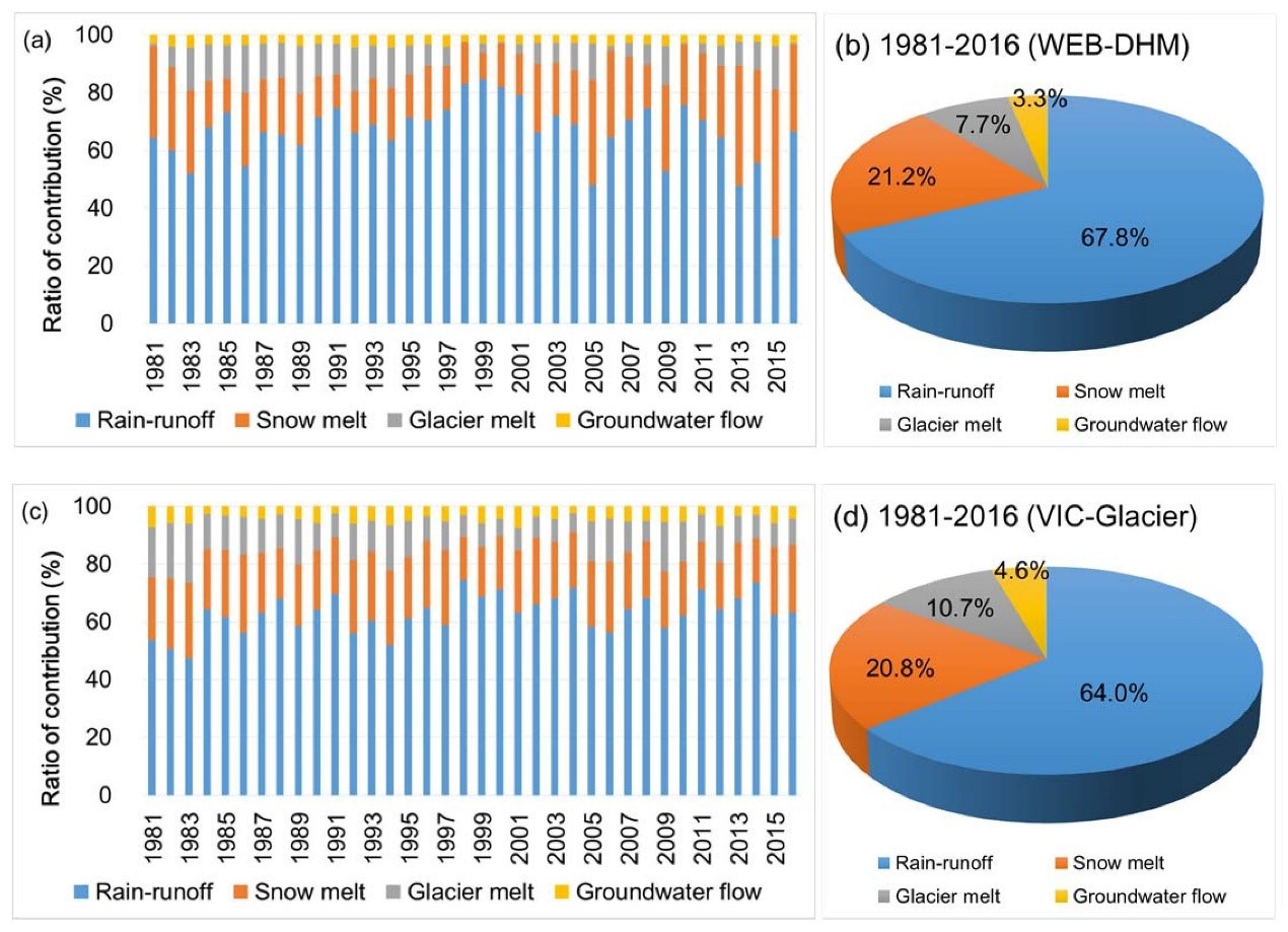 图2 WEB-DHM (a, b)和 VIC-Glacier (c, d)在奴下水文站模拟的径流组分比较。(a)和(c)为 1981-2016 年模拟的降雨径流、融雪径流、冰川径流和地下水对逐年总径流的贡献;(b)和(d)为1981-2016年间的多年均值。