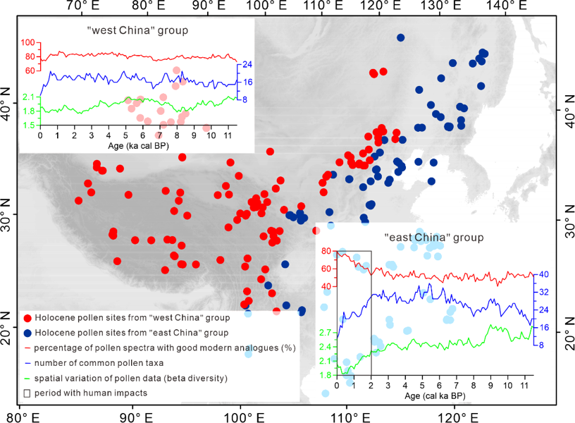 中国科学院青藏高原研究所古生态与人类适应团队陈发虎院士和曹现勇研究员联合国内外合作者,基于中国全新世地层孢粉数据集和亚洲现代孢粉数据集,通过评估地层和现代孢粉组合相似性、孢粉多样性等手段,发现我国先民土地利用对植被大规模影响在空间上局限于我国东部地区,时间上局限于过去2千年。