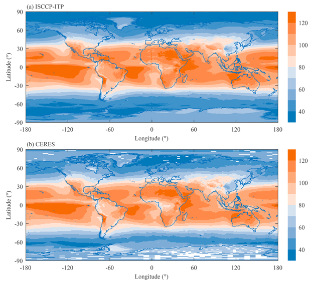 图1.ISCCP-ITP(a)与CERES(b)多年平均PAR的空间分布对比(2001-2018)