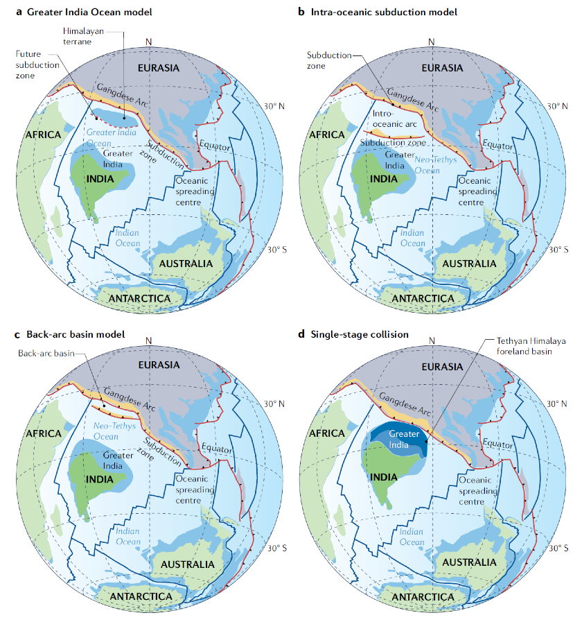 目前,关于新特提斯洋闭合历史的假说包括:大印度洋盆模型(图2a)、洋内俯冲模型(图2c-d)和单阶段俯冲碰撞模型(图2d)。这些假说对大印度(已俯冲消失到青藏高原下的印度部分)的规模以及印度-欧亚大陆初始碰撞时间做出了截然不同的预测。然而,以上模型都是基于丁林院士团队等发现的关键证据—即印度-欧亚大陆碰撞形成的前陆盆地,该盆地在6500万年至5900万年之间开始接受来自冈底斯岛弧区的物源,表明此时印度-欧亚大陆已经开始开始碰撞,大大早于此前国际公认的印度与亚洲大陆在5000万年才初始碰撞的时间。