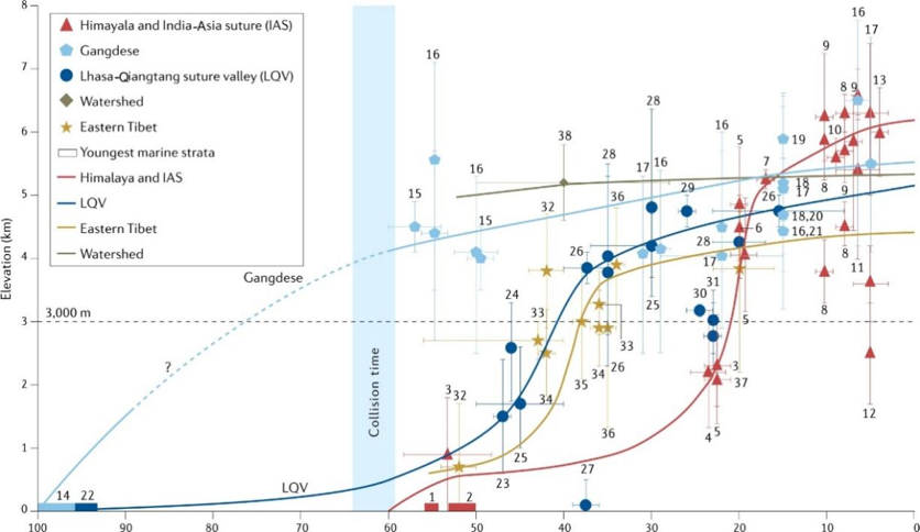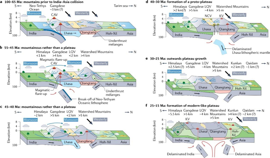 通过详细分析青藏高原白垩纪海陆转换、构造变形、岩浆和低温热年代学证据,研究团队提出,拉萨-羌塘地体的碰撞以及随后的拉萨岩石圈向北俯冲导致了分水岭山脉的初步生长;南部新特提斯洋的持续俯冲,在约9500万年前将冈底斯地区隆升至海平面之上,从而形成与现今的安第斯山相似的发展过程,称之为安第斯型冈底斯山,并在藏南地区形成显著的降水效应。此时的青藏高原仅有两条狭窄的山脉,即分水岭山脉和冈底斯山脉,但地表隆起的幅度仍有待量化。