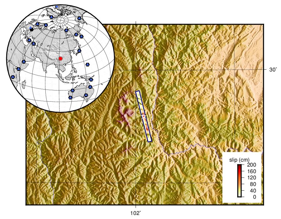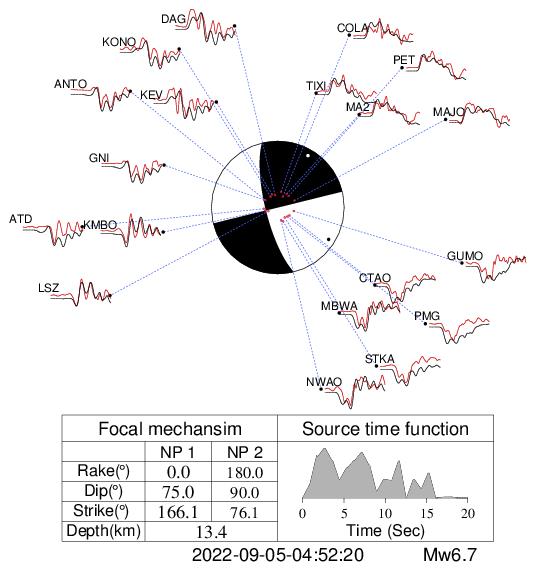 北京时间2022年9月5日12点52分 (UTC 2022-9-5 04:52:20) 在我国四川省泸定县发生了M6.8级地震。地震发生后,我们从IRIS数据中心下载了地震数据资料用于研究地震震源机制和震源破裂过程。选取其中信噪比较高并且沿方位角分布比较均匀的19个远场P波波形(震中距位于30°<△<90°范围之内)和21个SH波波形资料进行点源模型的震源机制解反演;根据反演结果构建有限断层模型进行震源过程反演,获得了这次地震破裂滑动分布的初步结果。计算得到的地震矩为1.2×1019Nm,Mw=6.65。最大滑动192cm。