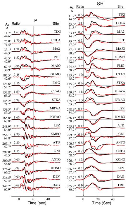 Figure 2 Comparison of the observed teleseismic P and SH records with the synthetic waveforms.