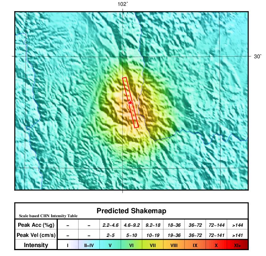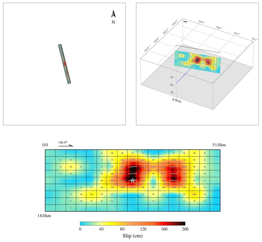 初步结果表明:这次地震为震级Mw6.7,震源深度约13km的高倾角走滑型地震,破裂持续时间约15秒。计算震中区的理论地震烈度(中国地震烈度表,2008)约为IX度。