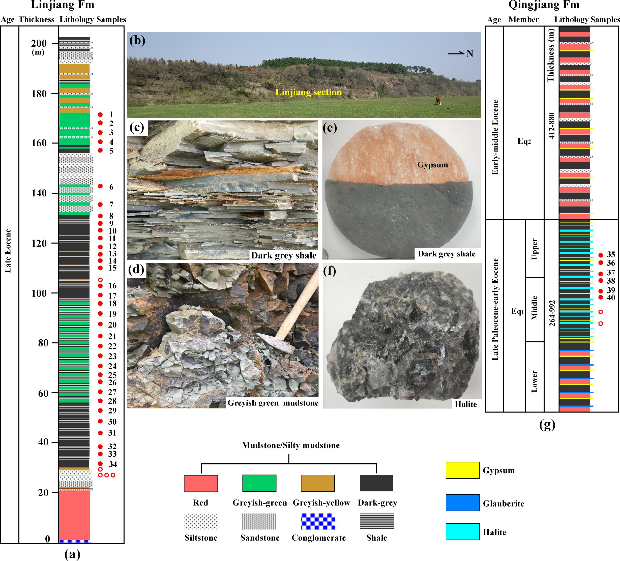 清江盆地位于江西省中部(28°N),是一个内陆断陷盆地,盆地内晚白垩至古近纪地层发育,是我国南方重要的岩盐产地(图1)。中国科学院青藏高原研究所新生代环境团队谢宇龙博士等发现,清江盆地早始新世清江组发育了大量指示干热气候的蒸发岩沉积(岩盐、石膏和钙芒硝),晚始新世临江组则转变为淡水湖相沉积(图2)。上述岩性的重大转变暗示了清江盆地始新世的气候经历了由干旱到潮湿的重大转变,很可能是对季风建立的沉积响应,有望解开江南何时从荒漠变为水乡的谜题。