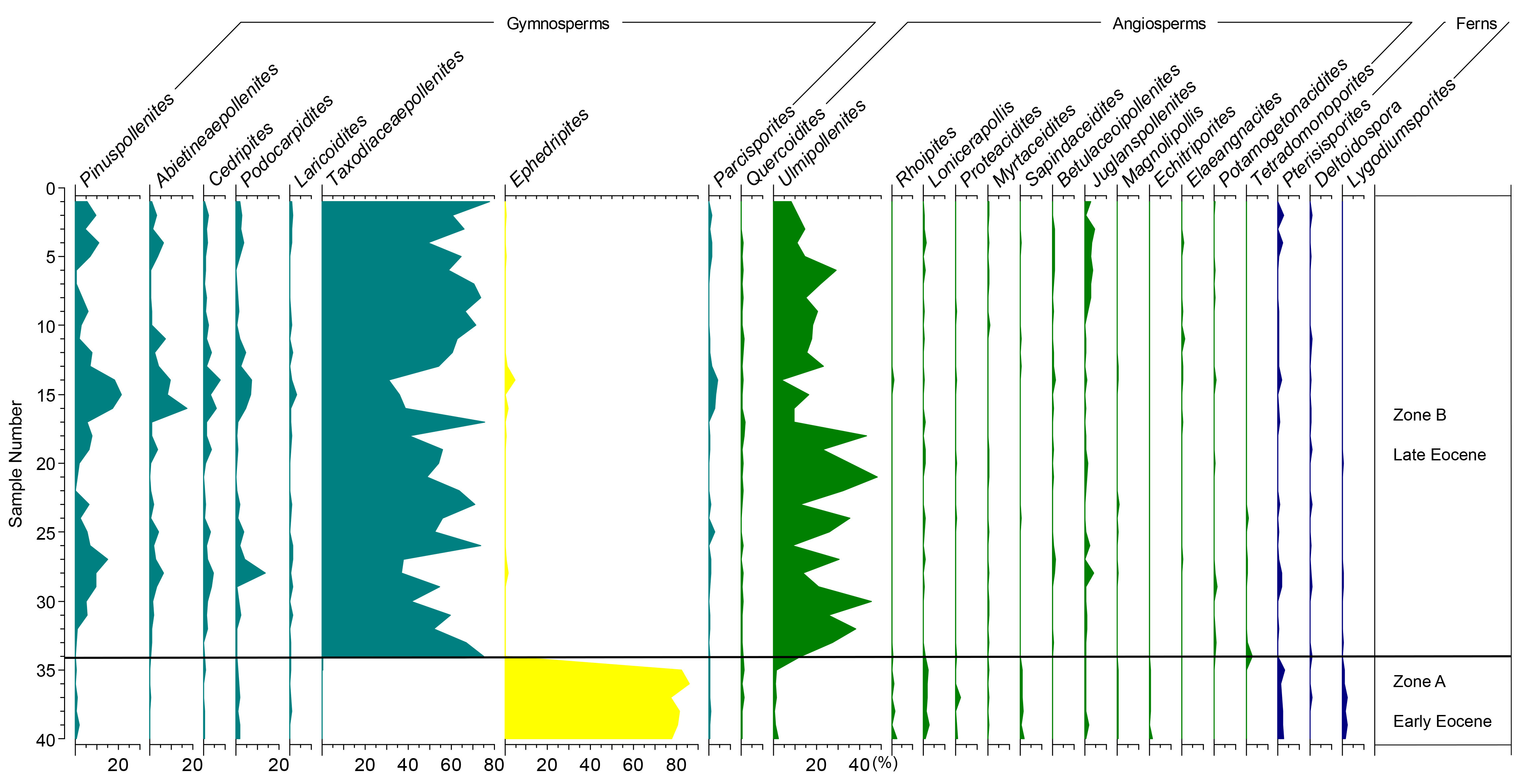 图3 清江盆地早始新世(Zone A)和晚始新世(Zone B)主要孢粉类型百分比图谱