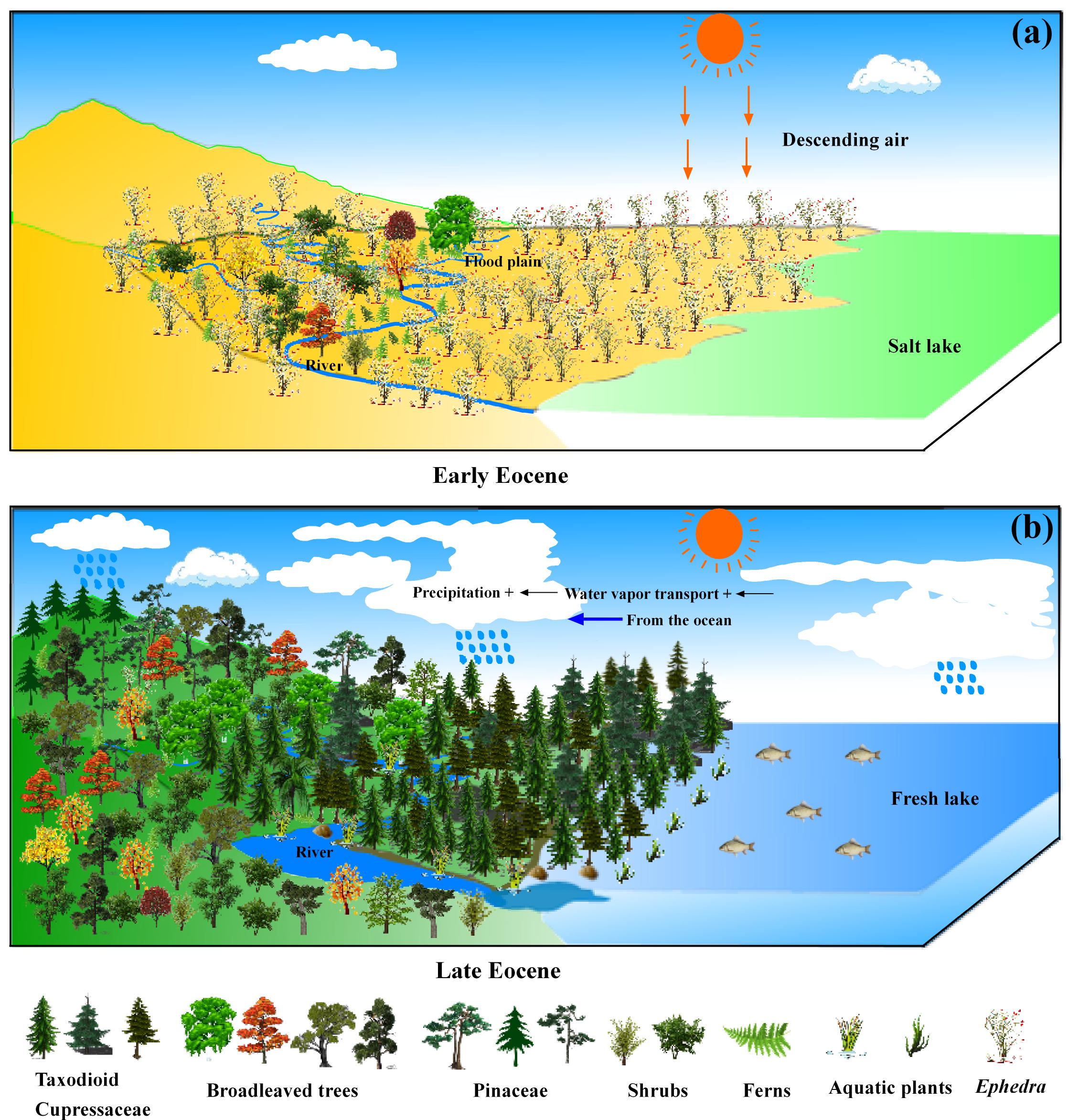 图4 清江盆地始新世植被景观(陆地生态系统)演变图,(a)早始新世:以耐旱麻黄为主的灌木荒漠,(b)晚始新世:以喜湿润的杉科植物和山地针阔混交林为主的沼泽森林