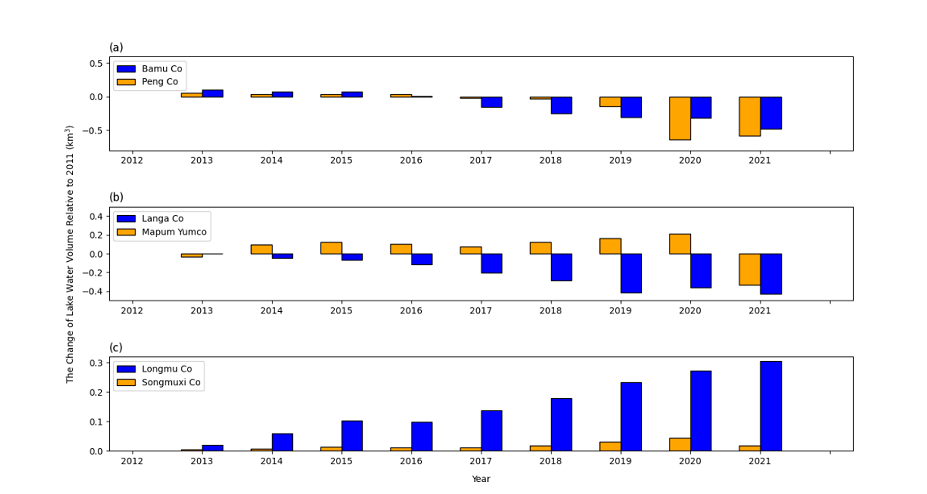 根据青藏高原地区的大气环流场和局地干湿条件,研究团队将青藏高原划分为季风区、西风区和西风-季风协同作用区,选取其中相邻且地形条件相同的三组湖泊:位于季风区的巴木错-蓬错,位于西风区的龙木错-松木西错和位于西风-季风协同作用区的拉昂错-玛旁雍措。三组湖泊的面积、水位、水量变化趋势均不尽相同,从年水量相对变化(相较于2012年湖泊水量)来看,位于季风区的巴木错和蓬错在2017年以前相对稳定;位于西风-季风协同作用区的拉昂错和玛旁雍措表现不同,拉昂错逐年萎缩而玛旁雍措在2020年前较为稳定,之后水量减少;位于西风区的龙木错和松木西错呈逐年扩张趋势。从2018年-2021年的月相对变化(相对于每一年有湖泊水位观测的第一个月)来看,位于季风区的巴木错水量相对变化逐年增加,具有明显的季节性变化;位于西风季风协同作用区的拉昂错在2019年有明显的水量变化,2020和2021年水量变化相对稳定;位于西风区的龙木错同样是2019年有明显的水量变化,可能与2019年西风带异常波动有关。