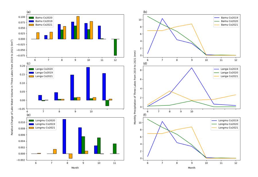 图3 2019-2021年湖泊水量相对月变化和降水月变化, (a, b)巴木错湖泊水量相对变化和降水, (c, d)拉昂错湖泊水量相对变化和降水, (e, f)龙木错湖泊水量相对变化和降水