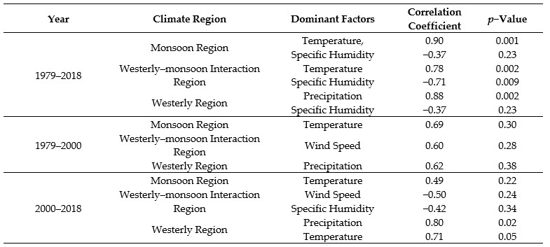 为了进一步厘清不同气候因子对湖泊变化的影响,作者对气温、降水、相对湿度和风速与湖泊变化的相关性进行了计算。通过排序发现,不同气候区主导湖泊变化的气候因子不同,且不同时间段的主导因子也不同。在季风区,气温升高是促进湖泊扩张的主要原因;在西风-季风协同作用区,蒸发增加是导致湖泊萎缩的主要原因;在西风区,降水增加是促进湖泊扩张的主要原因。