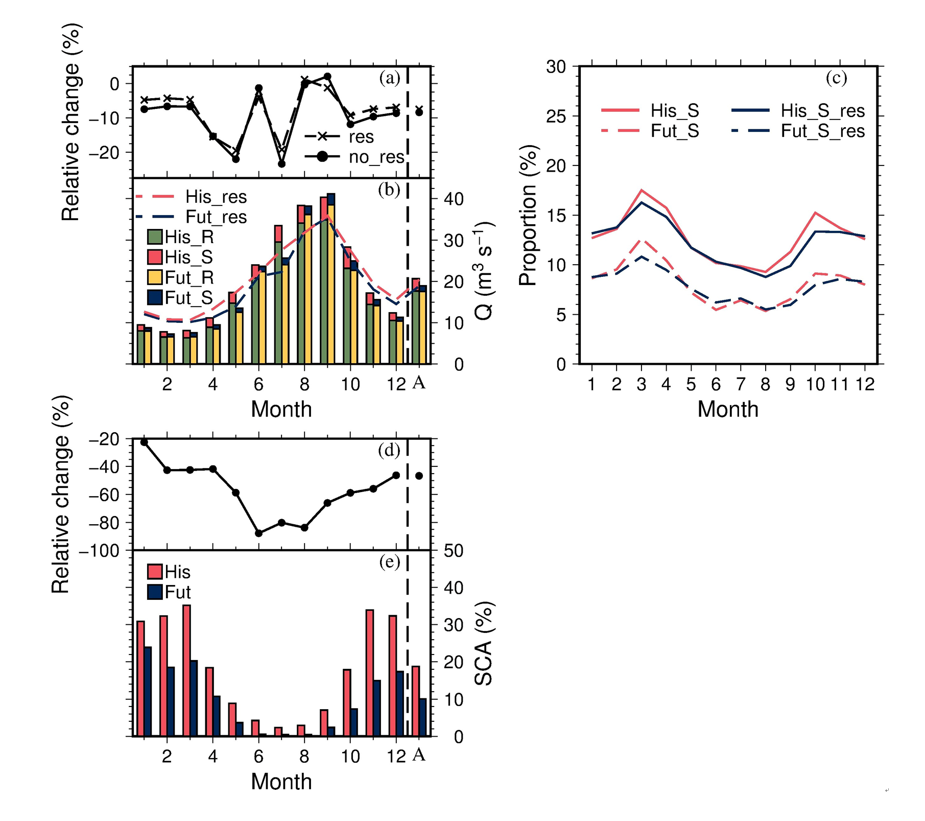 图2 历史和未来条件下流域出口处径流对比 (a,b)、有无水库调节下径流融雪贡献率对比(c)和流域积雪覆盖率对比(d,e)