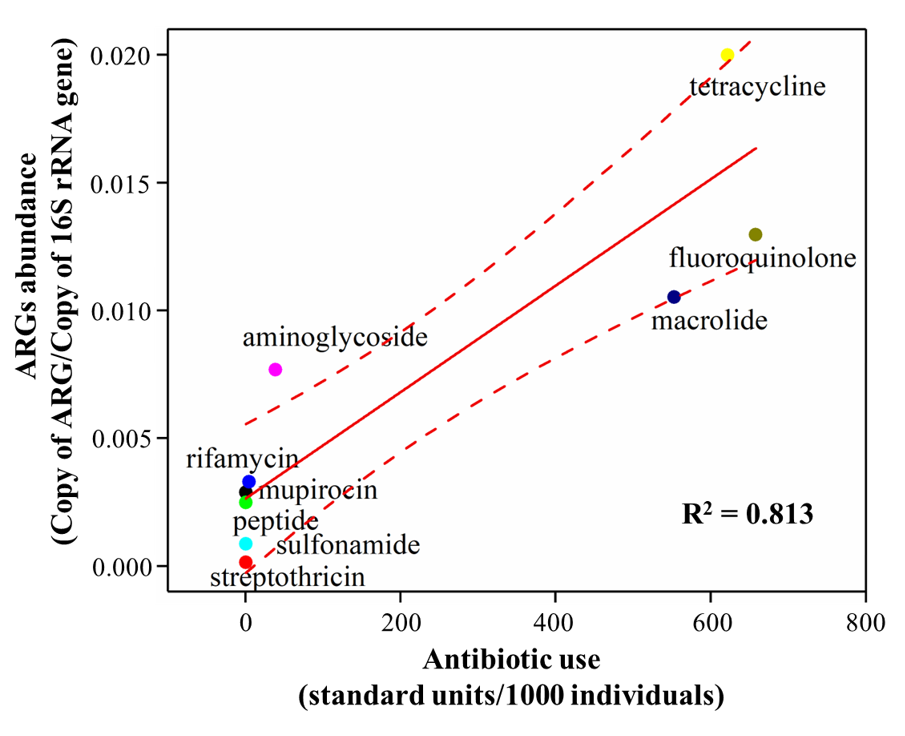 图2 青藏高原冰川抗性基因丰度与抗生素使用量的关系