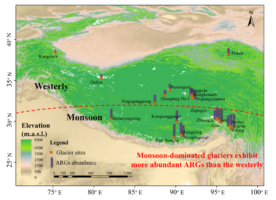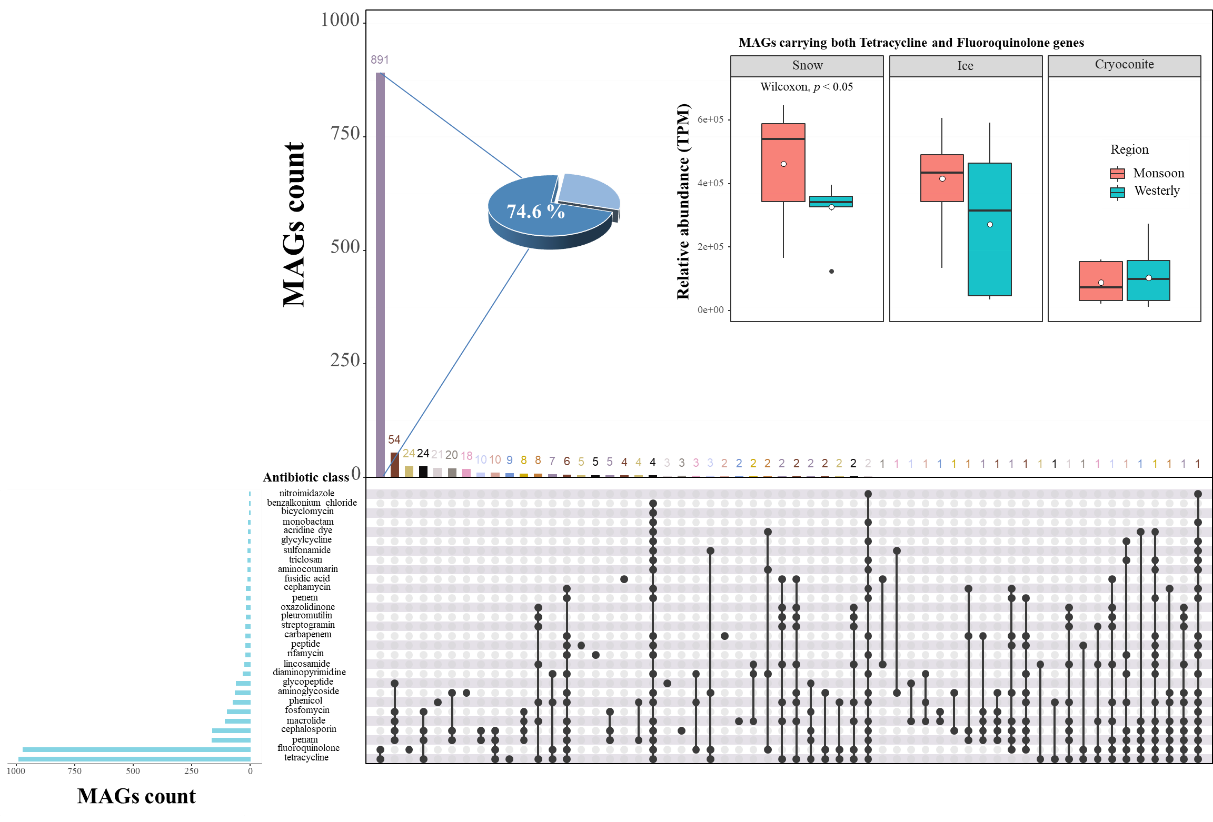 上述研究成果以“Monsoon affects the distribution of antibiotic resistome in Tibetan glaciers”为题,发表在《Environmental Pollution》上。我所特别研究助理毛冠男博士为第一作者,刘勇勤研究员为通讯作者。该研究得到了第二次青藏高原综合科学考察研究专项(2019QZKK0503、2021QZKK0100)、国家重点研发计划(2021YFC2300904)、国家自然科学基金(91851207、42101128)以及“一带一路”国际科学组织联盟联合研究合作专项(ANSO-CR-KP-2021-04)共同资助。